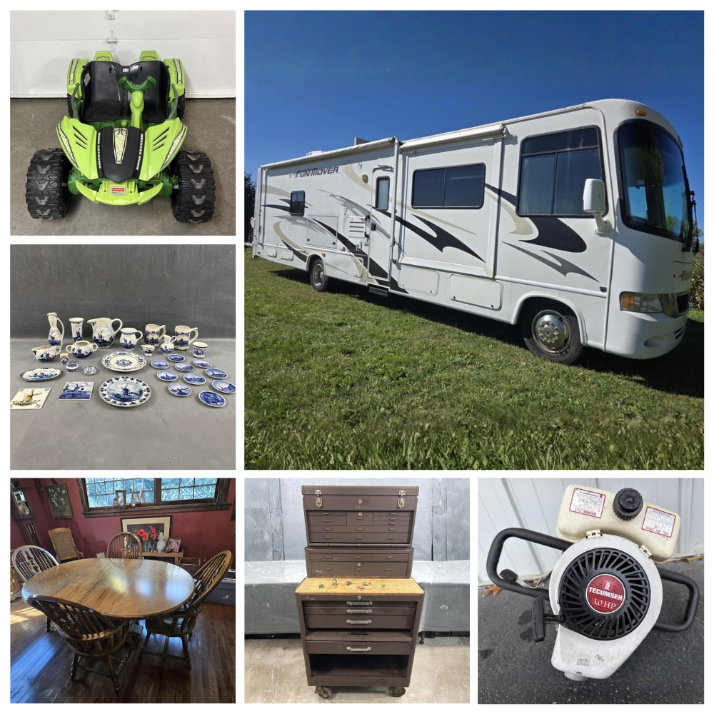 Online-only auction featuring tools, outdoor equipment, household goods, collectibles, and a well-maintained RV (simulcast). Bidding open November 3–25. Preview and pick-up in Hillsdale, MI.