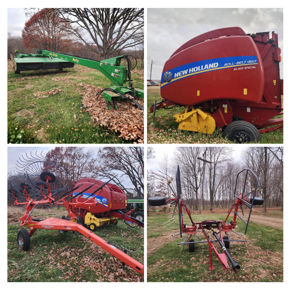 Online auction featuring a John Deere 946 Moco, New Holland Roll-Belt 460 baler, Kuhn SR112GII hay rake, and H&S RT5200H twin rake. Clean, field-ready equipment. Auction ends December 18, 2025. Visit michaelauctions.biz or call Sid or John Michael for details. Hillsdale, MI.